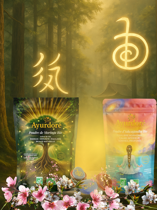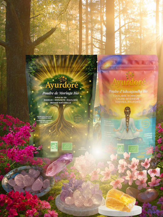 Nos superaliments 100% bio — Ashwagandha et Moringa — sont infusés d’énergie lunaire, de cristaux et de Reiki, pour activer votre vitalité et éveiller votre lumière intérieure. ✨ Un trésor sacré de la Terre Mère.